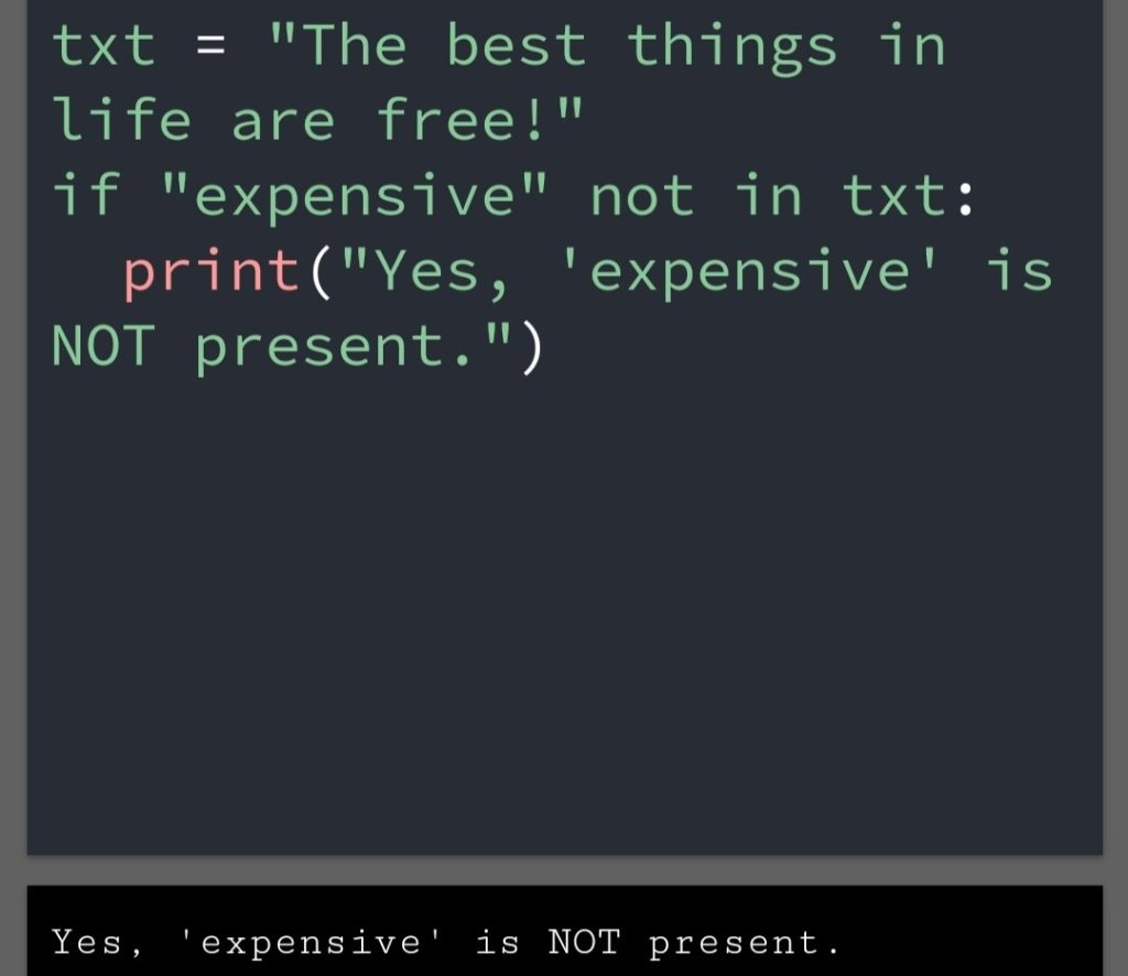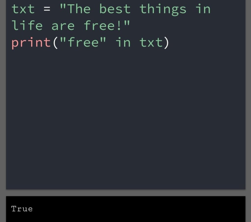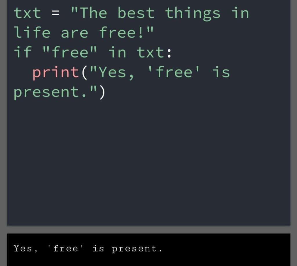 To check if a certain keyword is present in the string, we can use the keyword in.