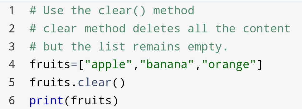The clear() method empties all the content of the list but the list remains. So, how can you do it?
