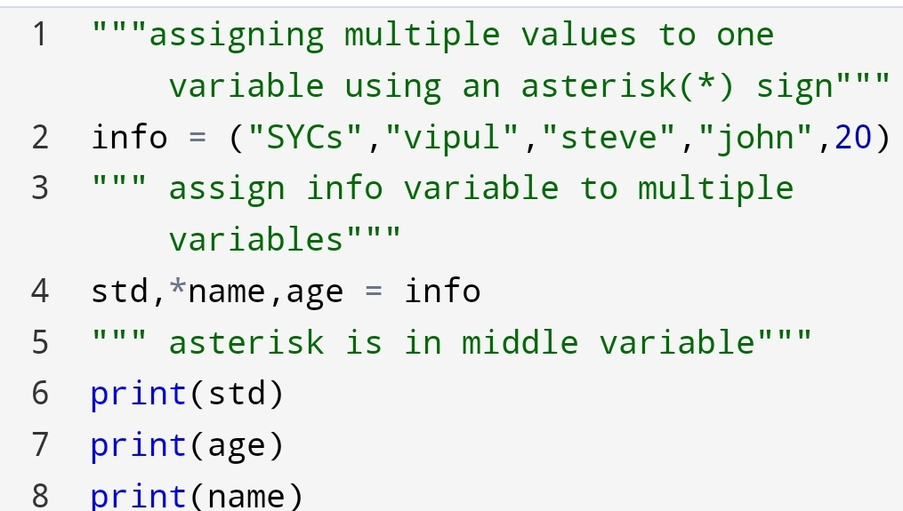 The first and last variable assign to the first and last values. And the middle variable going to assign the remaining variables.