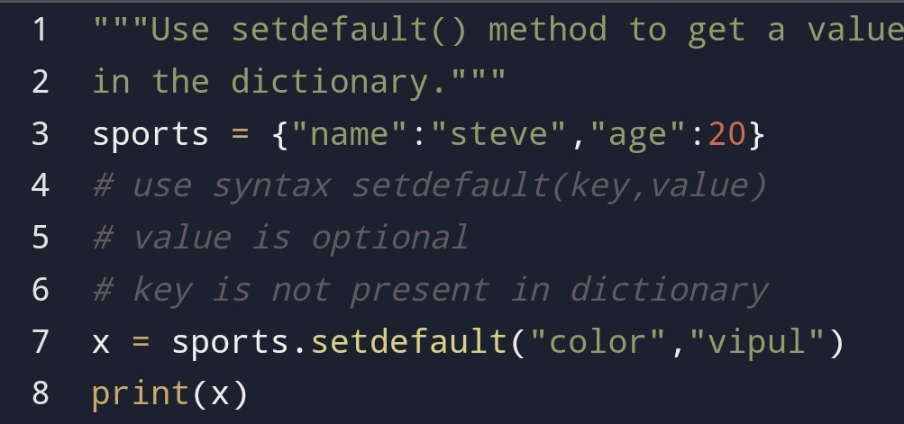 Here, you can see that the given key in the setdefault() method is present in the dictionary. So, the value came from the dictionary.